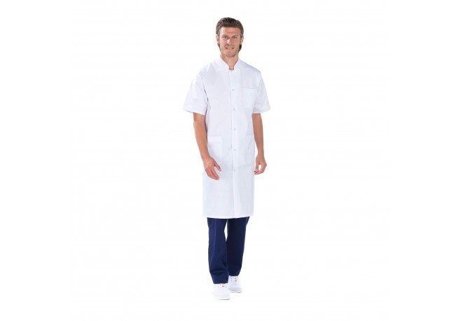 Blouse Homme manches courtes 2 poches côtés , 1 poche poitrine Fermeture par bouton pression Fentes côtés Longueur 110 cm 65% Polyester 35%Coton Lavable a 60°